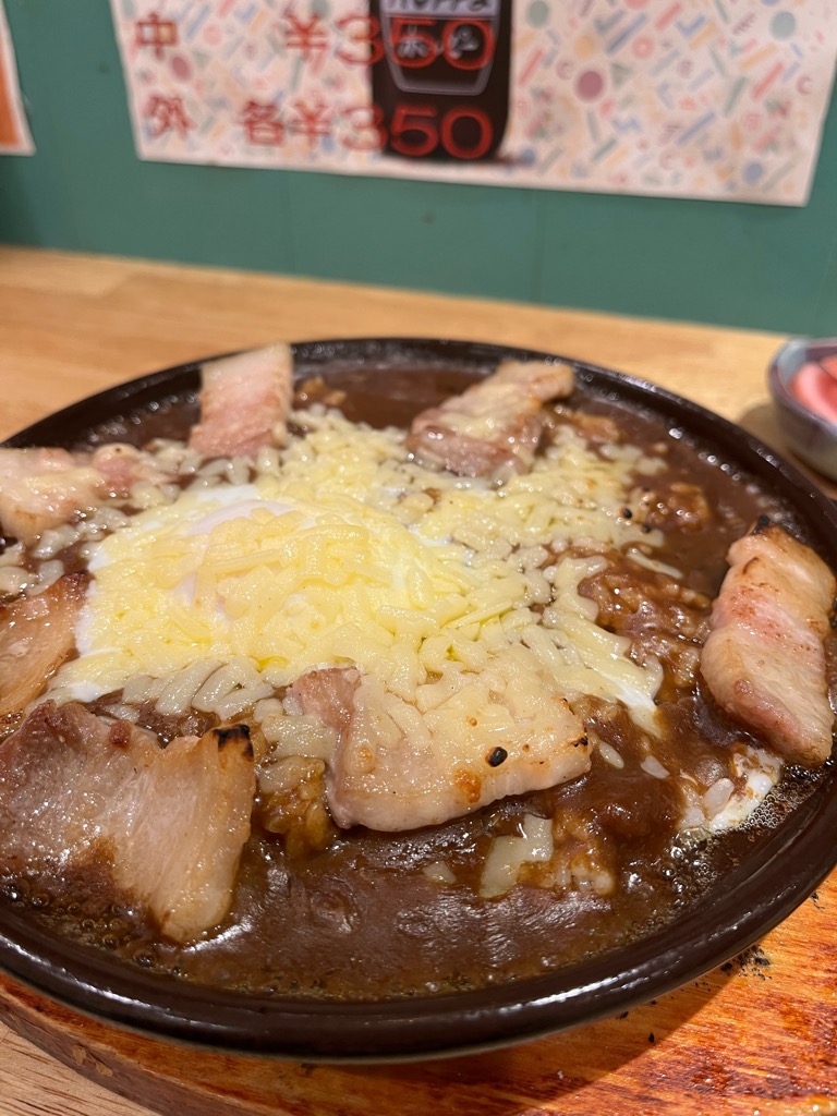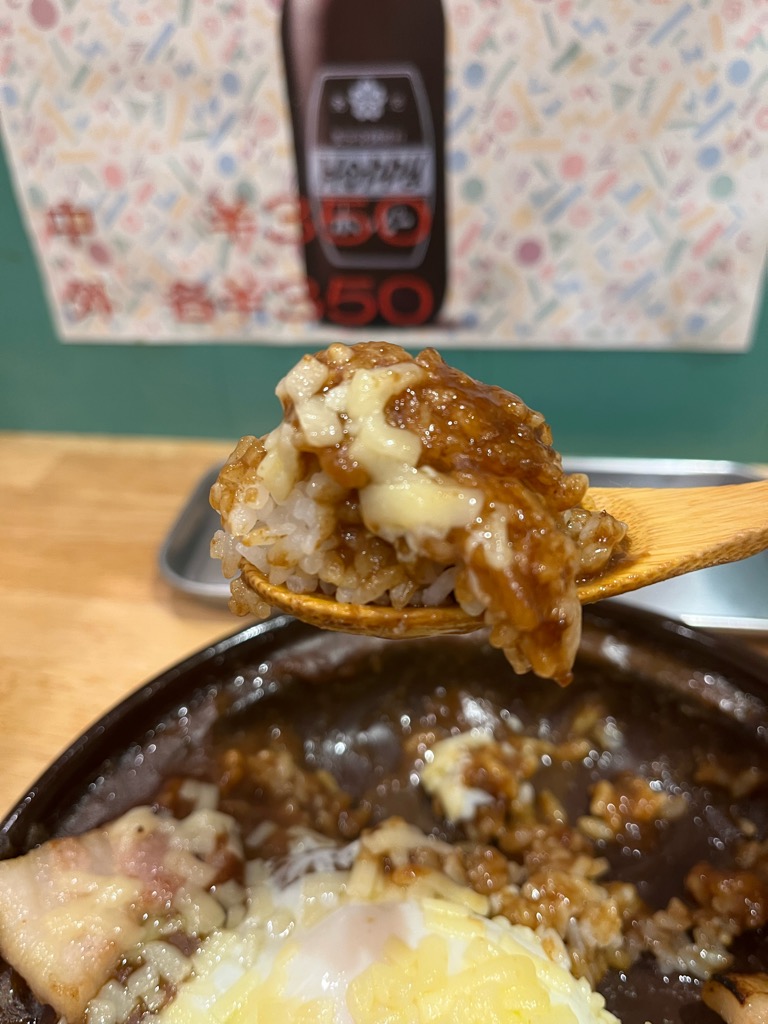 温度はアツアツ。注文後すぐに出てくるため、表面のチーズがまだとろみを残しつつも、その下は熱々のカレールウ。ひと匙をすくえば、しっとりとしたライスと、とろけたチーズ、カレーのルウが一体となって口の中に届きます。
