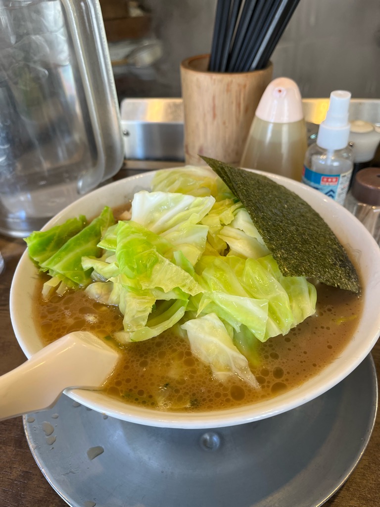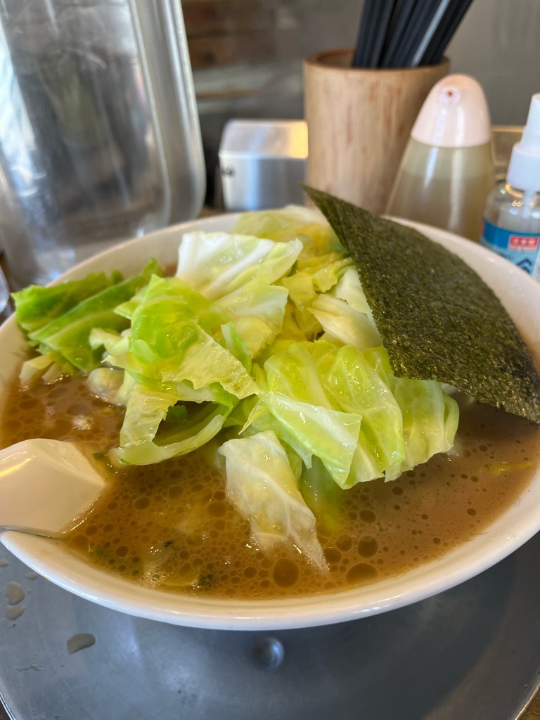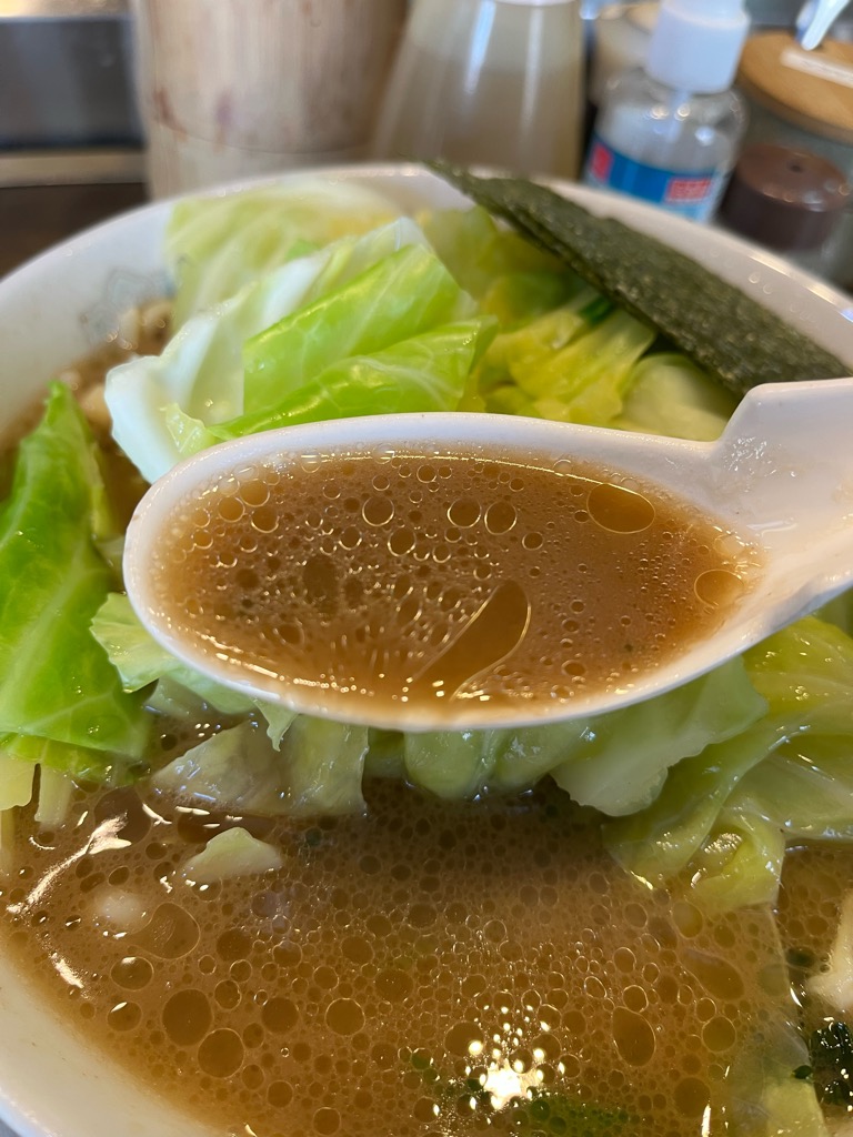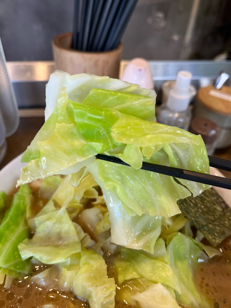 スープはとんこつのこくと醤油の香ばしさがじんわりと感じられ、キャベツの甘みがやさしく溶け込んでいます。