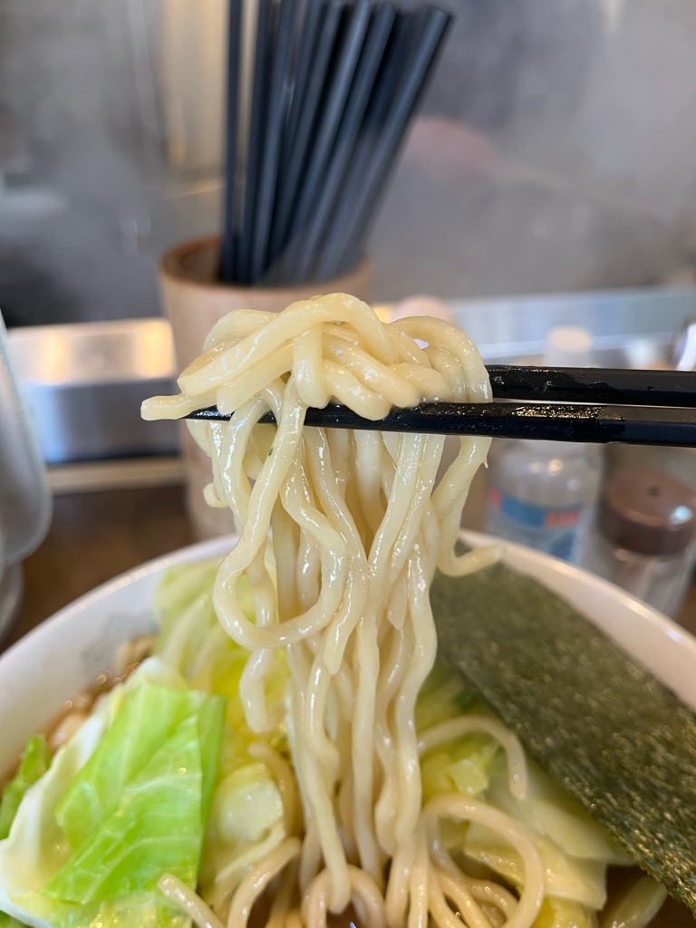 太麺・細麺が選べ、太麺にするともちっとした食感がスープとよく絡んで心地よい口当たりに。