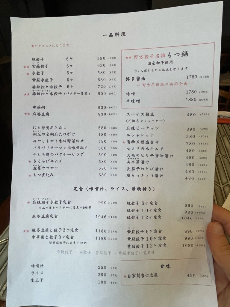 野方餃子 練馬翠庵メニュー