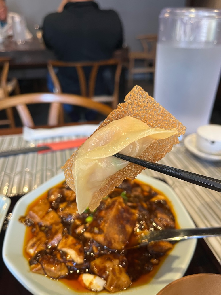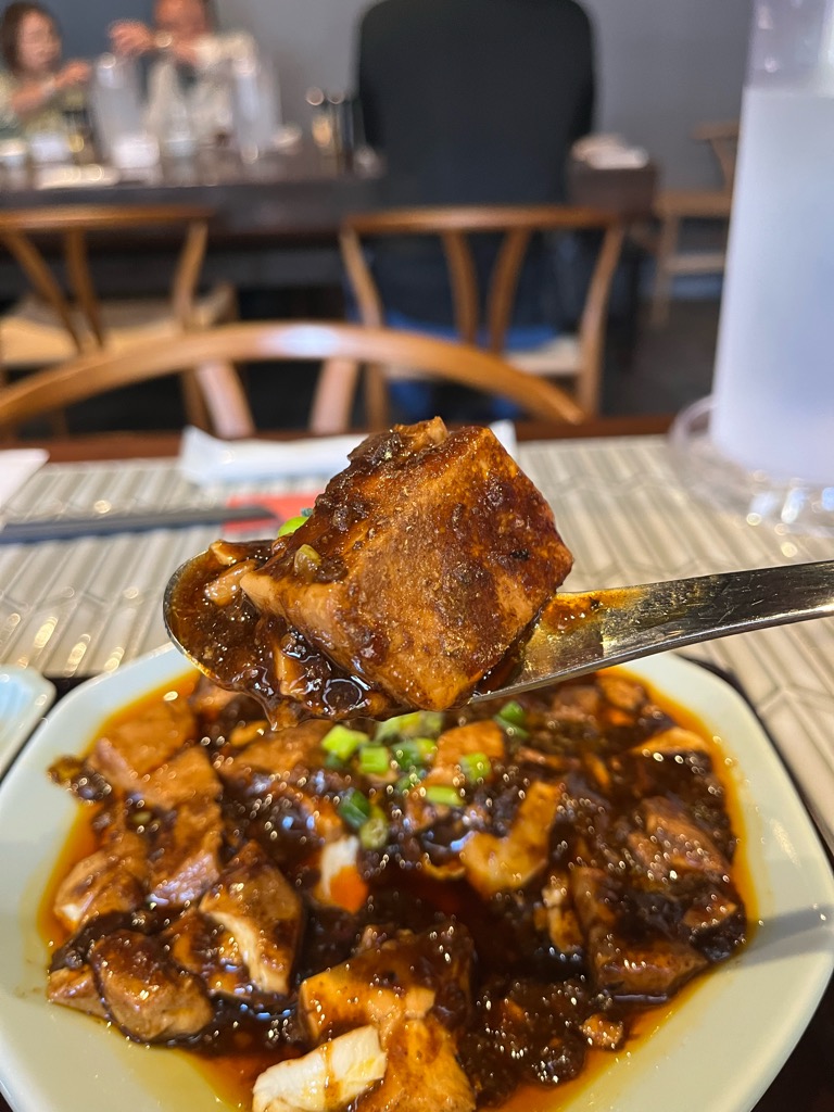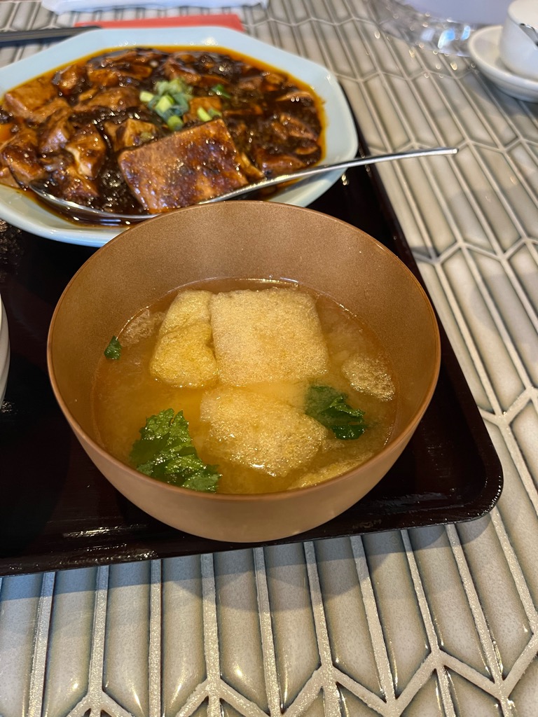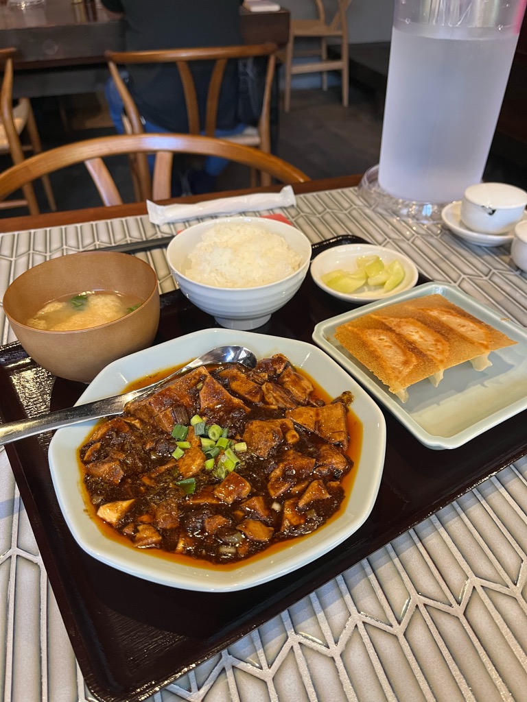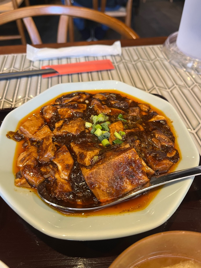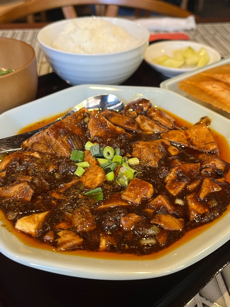 麻婆豆腐は山椒(花椒)の甘く痺れる香りがふんわりと漂い、その奥に挽き肉の旨味と甘辛さが控えめに潜む印象。