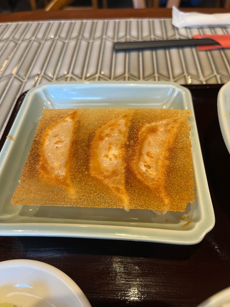餃子は三つ、羽根つきの焼き餃子で、一つ一つが小ぶりに仕上がっています。