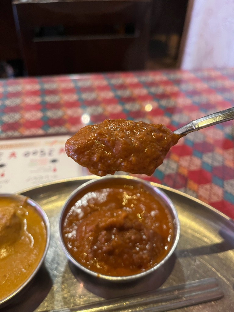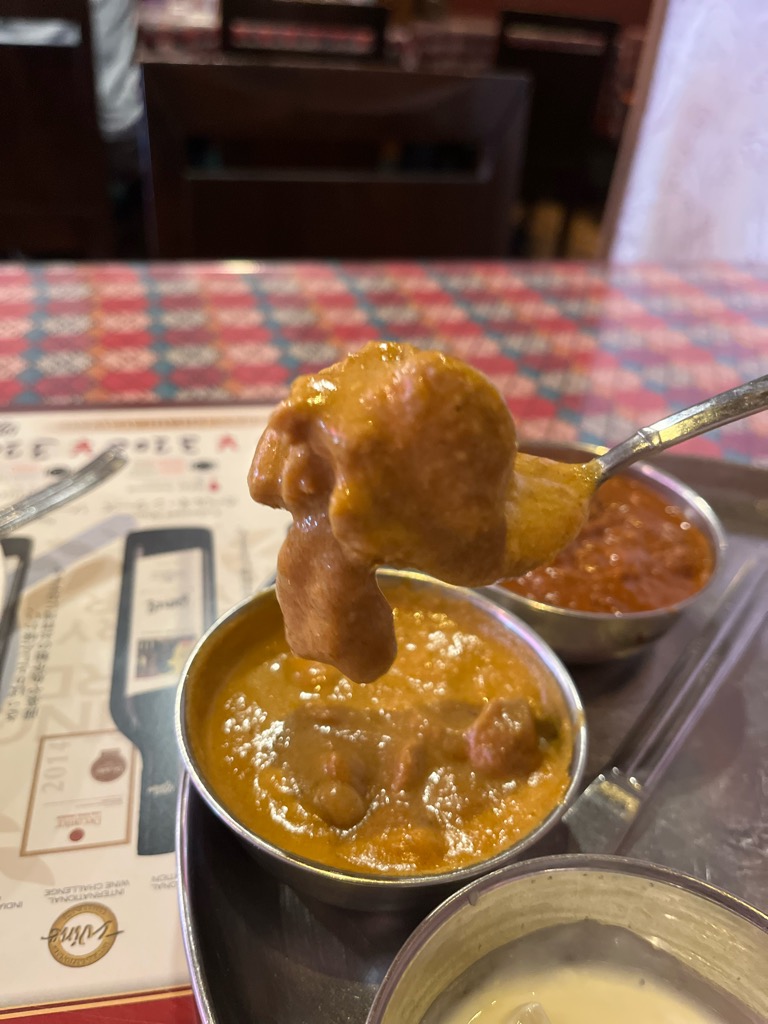 キーマカレーはスプーンで一口すくうと、「ざくっ」とした挽き肉の食感が最初に伝わり、続いてクリーミーな液体が舌の上に広がります。
