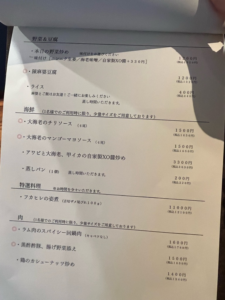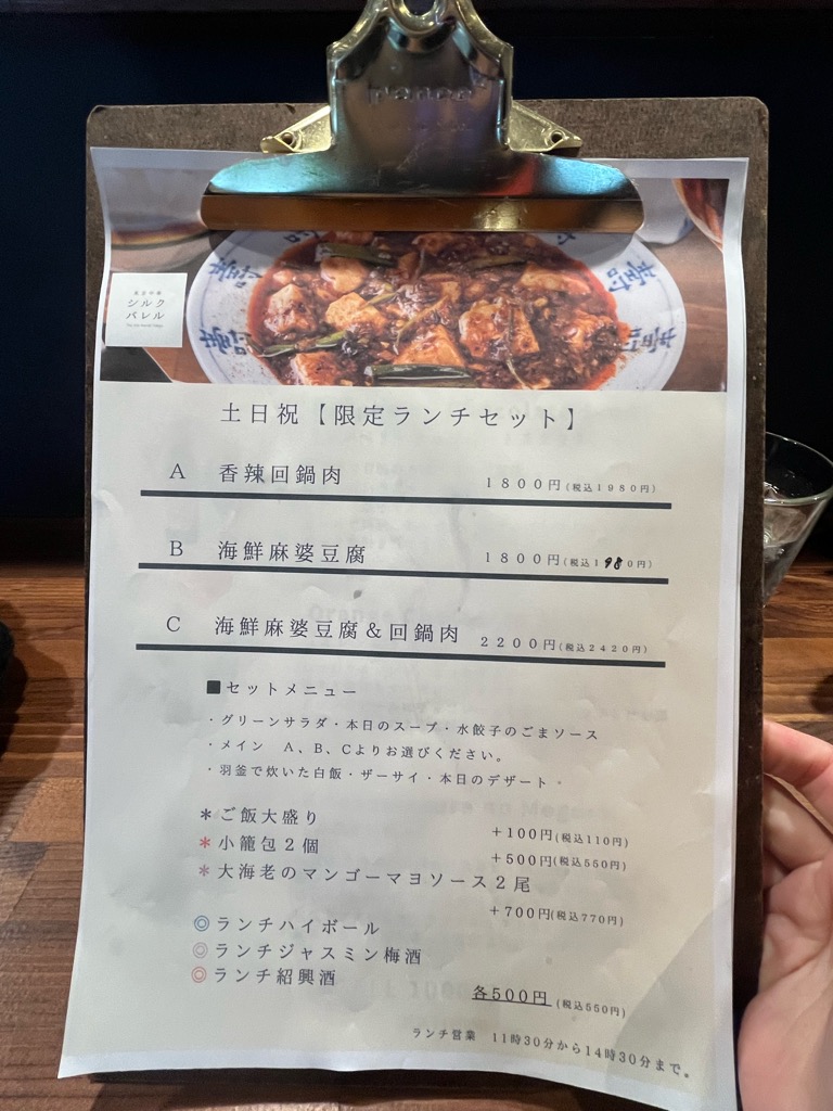 土日祝限定でランチが食べられます。今回は「香辣回鍋肉(1980円)」を注文。