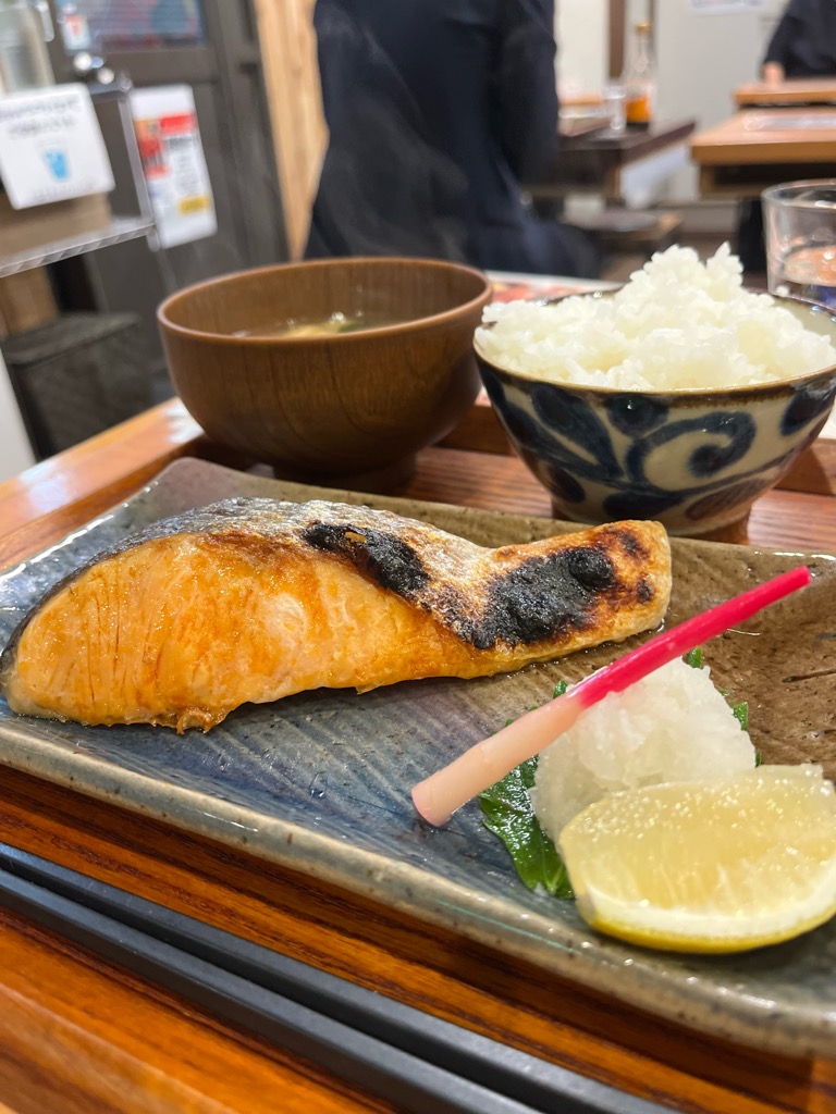 皿に盛られた主役の鮭—金色に照らされた皮目が香ばしく、うっすらと立ち上る炭火のような香りが食欲をそそります。